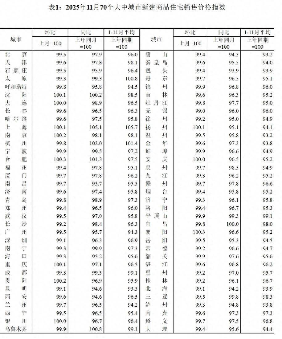 12月15日,国家统计局发布《2025年11月份70个大中城市商品住宅销售价格变动情况》。对此,国家统计局城市司首席统计师王中华解读表示:“2025年11月份,70个大中城市商品住宅销售价格环比总体下降、同比降幅扩大。”