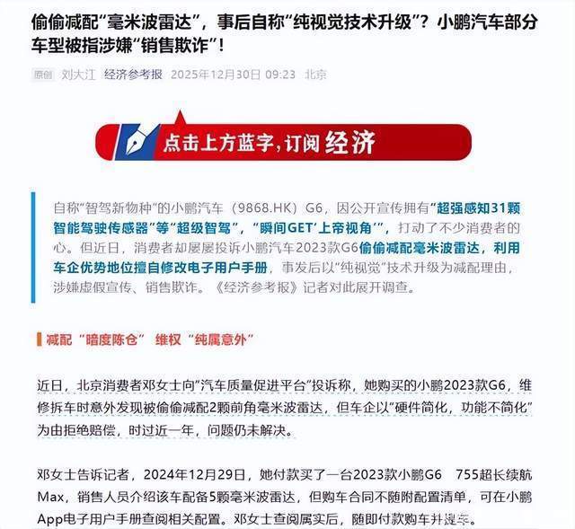 此次事件的暴露还有一些戏剧性,根据《经济参考报》的爆料,北京消费者邓女士于2024年12月29日购买了一台2023款小鹏G6 755超长续航Max版,购车时,销售人员明确告知该车配备5颗毫米波雷达,同时邓女士也在小鹏App的电子用户手册中确认了这款车型有这一配置。