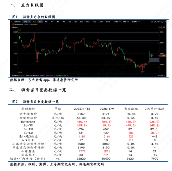 【1】盘面表现:BU 2603主力合约日内区间震荡,尾盘有所滑落。最终收盘价3157,较昨日结算价-0.25%,盘中最高触及3187,最低3135。按收盘价算近7天累计+3.9%。次月合约2606较昨日结算价涨幅0.13%。近月表现不及远月合约。
