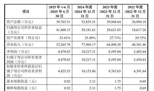 财务方面,于2022年度、2023年度、2024年度及2025年1-6月,公司实现营业收入分别约为4.84亿元、6.45亿元、7.8亿元、3.23亿元人民币。